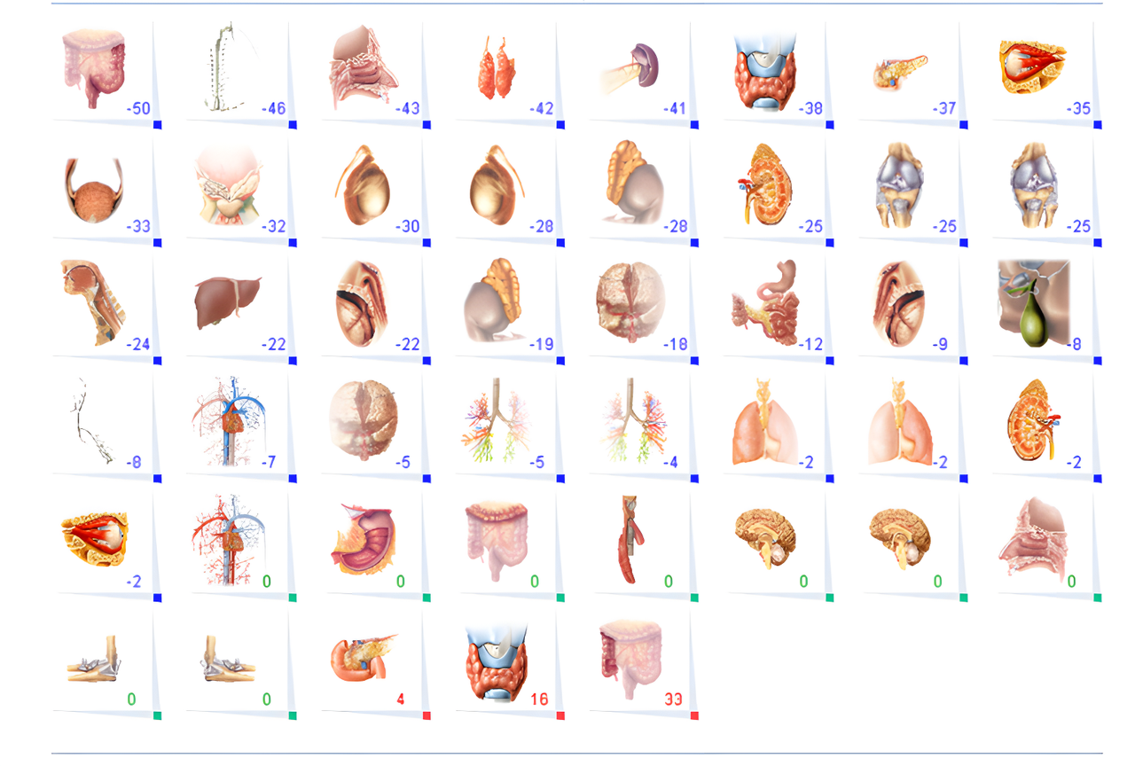-   Системи  . Дозволяють провести аналіз функціонального стану основних систем організму. Відхилення від норми в сторону гіпо- або гіперфункції системи ілюструються відповідними кольорами та процентними значеннями із позначками «+» (гіперфункція) або «-» (гіпофункція).